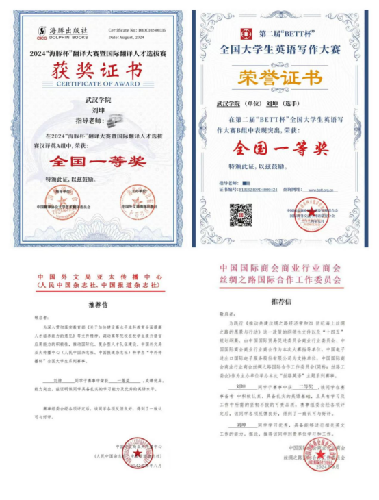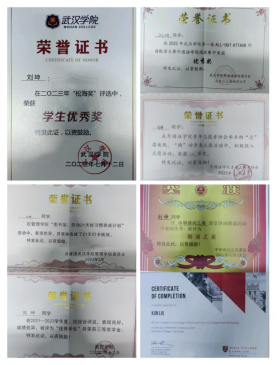 刘坤同学坚持以学业为重,始终保持着精益求精的学习态度,专业知识扎实,积极参与英语学科竞赛70多项,斩获省、国家级奖项36项及主办方推荐信两封。在校期间,他参与剑桥工作坊并以仅差五分满分的成绩结业,充分展现了他对知识的渴望与不懈追求。