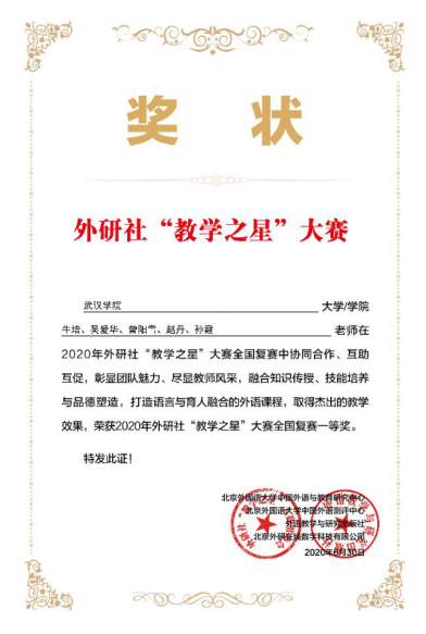 2020年外研社“教学之星”大赛自4月初启动以来,组委会共收到大学英语组406组、英语类专业组254组参赛教师团队的参赛材料。经资格审查及全国复赛通讯评审环节的激烈角逐,共64组团队成功晋级大学英语组全国半决赛、24组团队成功晋级英语类专业组全国半决赛,36365官网牛培等五位老师组成的团队成功晋级全国半决赛,并在复赛中获得一等奖的优异成绩,在与多所一本院校同台竞技的情况下,取得这样的成绩实属不易。