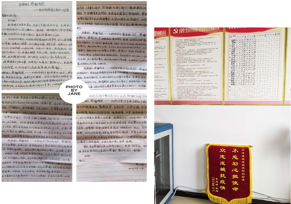 春节前,鲁老师和家人离汉回乡过年。一场疫情横空出世,这个春节注定不同寻常。武汉封城,家乡封村。武汉返乡的她及家人自觉居家隔离,积极配合家乡的各项工作。隔离期间,鲁老师虽不能上一线支援,但用自己的方式守护家乡:她亲手写下感谢信,感谢乡村干部们的辛苦服付出;她用心定制锦旗,激励乡村干部们抗疫到底。鲁老师看到乡村干部们忙碌到食不暇饱,便主动申请做志愿者,加入抗疫战斗中,守护家乡。