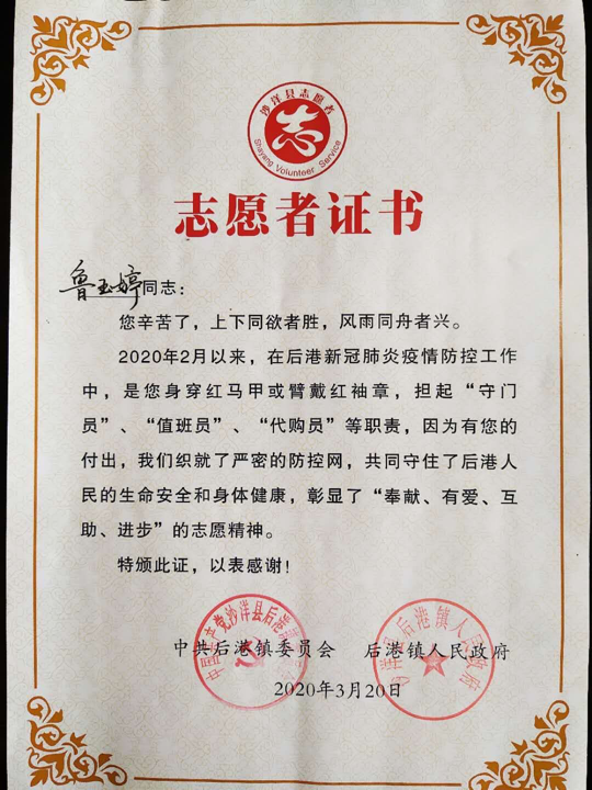 在家乡需要之时,鲁老师开始了她的抗疫志愿服务工作。鲁老师说:“我主要是完成‘疫情防控大数据平台’的村民信息录入,‘后港镇双村村(社区)人员流动台账’信息整理,办理村民健康证及接受函等工作。从家里步行到村办公室需要25分钟,每天来回4趟,在不影响工作的情况下还可以锻炼身体,很辛苦也很有意义。” 在鲁老师看来,志愿服务的每一天对我来说都是“只争朝夕,不负韶华”。