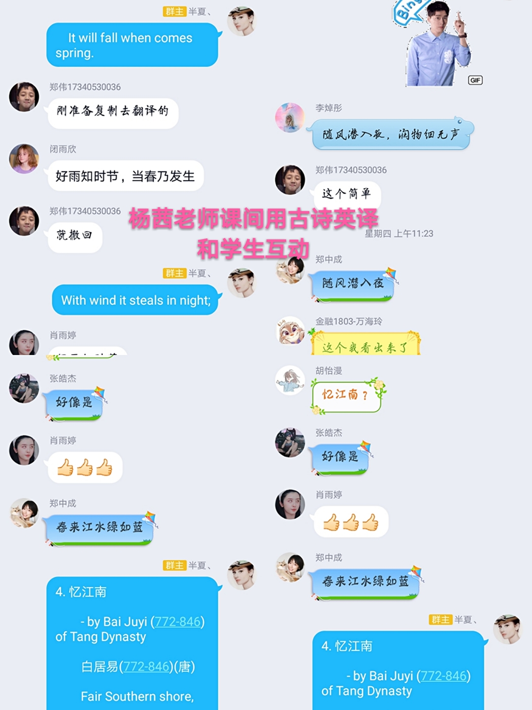 杨茜老师课间用古诗英译和学生互动