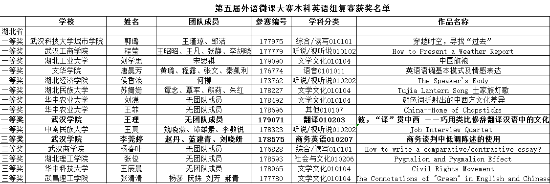 王理老师的微课《由此及彼,“译”贯中西——巧用类比修辞翻译汉语中的文化专有项》基于中西文化“同中有异,异中有同”的特点,帮助学生理解语言和文化的深层关系,寻找制约学生翻译能力提高的瓶颈,帮助学生提升跨文化交际能力,从根本上实现翻译能力的提高。王理老师的作品设计新颖、制作精美,内容充实,取得了评委们的一致赞赏,最终荣获湖北赛区一等奖。由李莞婷、赵丹、蓝建青、刘晓妍老师组成的团队制作的微课通过生动形象的画面,细致入微的分析,层层递进地剖析了商务英语谈判中低调陈述的效果和应用方法,帮助学生在跨文化交际中更好地表达积极,肯定的意思,减少谈判双方的摩擦,有效进行商务沟通,培养了学生跨文化交际的技能和情智能力,获得了评委们的青睐,最终荣获湖北省赛区三等奖。