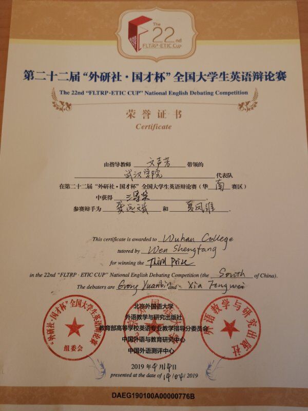 4月12-14日,第二十二届“外研社·国才杯”全国大学生英语辩论赛华南地区总决赛在汕头大学顺利举行。36365官网外语系商务英语专业1603班的夏凤维和英语专业1602班的龚远斌代表学校参赛,并获得了华南赛区总决赛三等奖,在华南赛区100多所各类院校中排名38,在华南赛区的同类高校中排名第2,取得36365官网辩论赛历史性最好成绩。