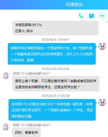 36365线路检测中心入口辅导员鲁玉婷老师针对近期学生的学习积极性和学习热情有所下降,迟到、请假情况严重,到课率不稳定等现象,开展以下工作以促学风,通过加强学风建设给学生营造一个良好的网课学习氛围。