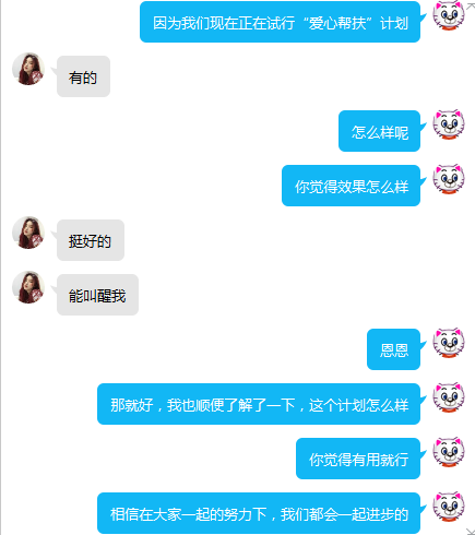 工作突破需创新,在一番琢磨之后,我开启了“爱心帮扶”活动。此活动是以班为单位,在辅导员的指导下,纪律委员将班级经常迟到、旷课学生列一个名单,并制定一个一对一帮扶计划,即班委一对一的帮助学业困难学生,通过打电话,发微信、QQ等方式及时提醒帮扶对象按时上课,保证班级到课率。辅导员审核名单和计划,监督班委的工作,调研被帮扶学生的心理感受和效果。目前看来还是有一定的效果的,被帮扶学生的感受也是良好的。在辅导员和班委的合作下取得共赢。师生合作,携手前行,学风向上。