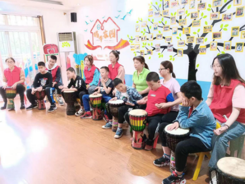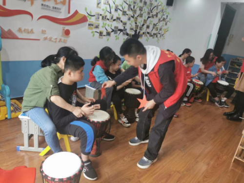 武汉的大雨没有阻挡住队员们关爱特殊儿童的热心,到达蜗牛家园时,孩子们刚刚结束了午休。孩子们热情洋溢的笑脸消除了队员们冒雨赶来的疲惫,队员们立刻精神抖擞的加入到孩子活动中,跟着老师的指挥和孩子们一起拍鼓、唱歌,密切的配合让孩子们的鼓声、歌声汇成了一片欢乐的海洋。