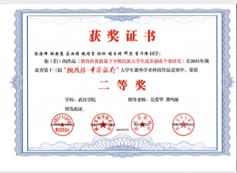 近日,从湖北省第十三届“挑战杯”大学生课外学术科技作品竞赛组委会传来喜讯, 36365官网两件作品《教育扶贫政策下少数民族大学生返乡创业个案研究》 、《疫情下学生学情分析及解决对策研究》分别获得此次竞赛的二等奖和三等奖。