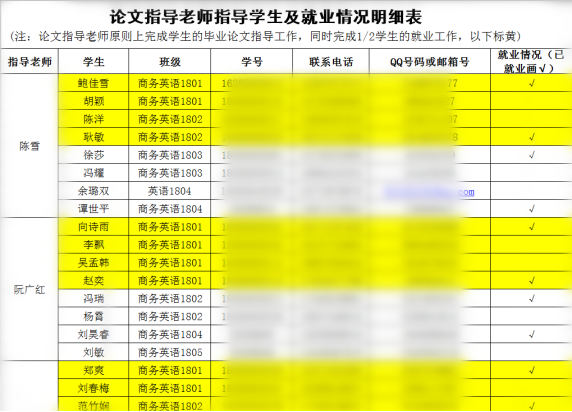 论文指导老师和实习指导老师共同为就业助力,学生就业与老师年终考核挂钩,学院修订了教师年度考核指标细则,将学生就业工作纳入教师年度考核,每周在全院发布老师指导学生就业进展情况,对教师起到了有效的督促作用。大学英语公共课部副主任蔡喆率先完成指标任务,指导的学生已经全部就业。全院形成“领导主抓、学院统筹、全员参与”的就业共同体,层层压紧压实了就业工作责任。