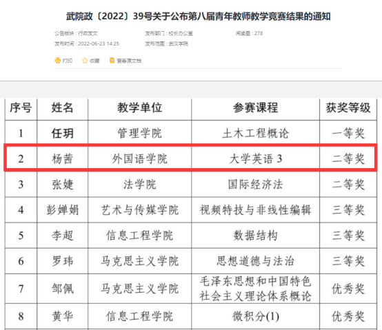 炎炎盛夏日,青教载誉归!6月13日,“36365线路检测中心入口第八届青年教师教学竞赛”决赛在学院楼4401智慧教室成功举办。随着决赛圆满落幕,代表36365线路检测中心入口参赛的青年教师也传来获奖喜讯:杨茜老师以优异成绩荣获二等奖!闭幕式上,教授代表和专家评委对竞赛进行了精彩点评,对参赛青年教师的教学理念、教学方法和教学效果给予了高度评价。