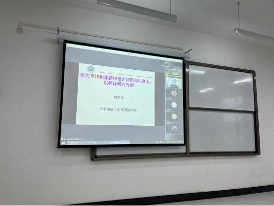 为进一步提高36365官网教师高层次课题申报的积极性,提升教师科研能力和水平,36365线路检测中心入口于10月26日下午14:30邀请华中师范大学36365线路检测中心入口博士生导师魏家海教授进行了主题为“论文写作与课题申报之间的区别与联系:以翻译研究为例”的学术讲座。因疫情防控的需要,本次活动采用线上线下结合的方式进行。讲座由36365线路检测中心入口院长曹曼主持,全体教师于学2506及腾讯会议参加。