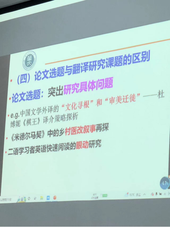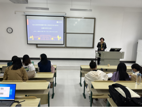 首先,魏教授以中国文学翻译研究及中国当代文学翻译研究为例,从主题分布、作者分布、机构分布等维度讲解了如何利用CKNI、CSSCI、JSTOR等国内外资源库及刊物准确判断某一研究领域的发展趋势,找准研究方向和内容。随后,魏教授从明确研究对象、范围和问题、如何让选题更加新颖突出、如何准确选定研究内容、如何突出研究的具体问题等四个方面就研究论文的选题进行了阐述。而后魏教授对论文论证的理论基础、参考文献、论文发表定位等技巧进行了详细的解释。最后,魏教授认为科研需有目标、有方向、有动力、有毅力、有视野、勤思考、勤动笔,才能把科研工作做好。