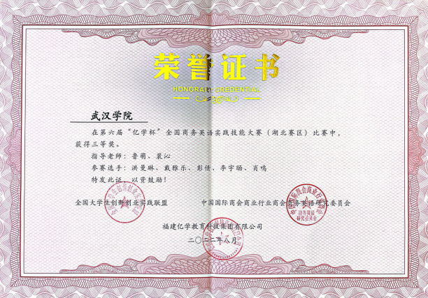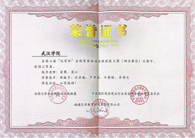 为进一步提升商务英语学生的职业能力与职业素养,培养学生商务英语实践技能,36365线路检测中心入口商务英语系组织学生参加了2022年第六届“亿学杯”全国商务英语实践技能大赛,两支参赛队伍均荣获湖北省赛区三等奖。“亿学杯”全国商务英语实践技能大赛由全国大学生创新创业实践联盟和中国国际商会商业行业商会商务英语研究委员会共同主办。