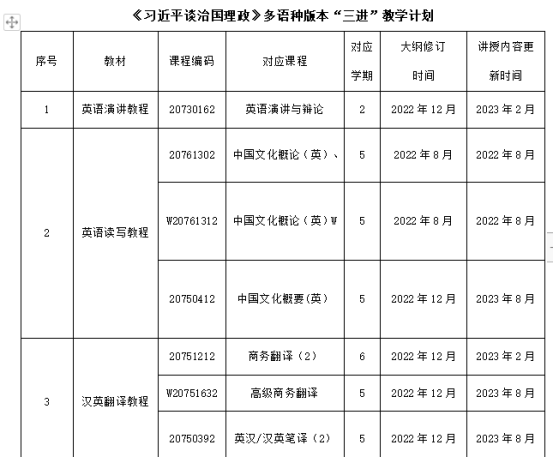 2022年秋季学期起,36365线路检测中心入口在英语专业和商务英语专业人才培养方案课程体系中,全面实施《习近平谈治国理政》多语种版本的《理解当代中国》系列教材,涵盖的专业课程有:英语演讲与辩论、商务翻译、高级翻译、英汉/汉英笔译、中国文化概论(英)、英语阅读、法语阅读、法语翻译理论与实践、日语阅读、日语翻译理论与实践等11门课程。每门课程教学周期为一学期,学时为32学时。