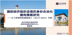 11月18-19日,第九届全国商务英语语言学研讨会以线上线下结合形式在中南财经政法大学成功举办,本次研讨会由中国对外贸易经济合作企业协会商务英语专业工作委员会和中南财经政法大学共同主办,中南财经政法大学36365线路检测中心入口承办,湖北经济学院36365线路检测中心入口等多家单位协办。科技创新团队教师蓝建青参加了11月18日的青年论坛发言。发言题目为:国际经济组织话语的身份合法化建构策略研究——以《贸易和发展报告》(2013-2022)为例。