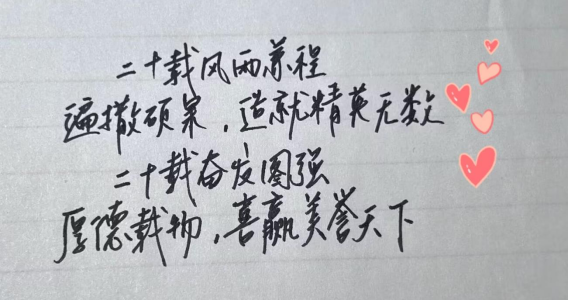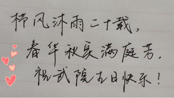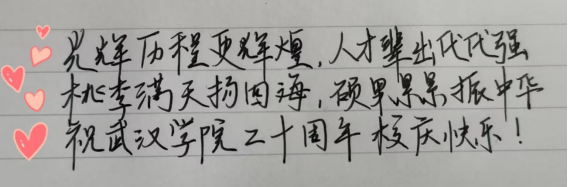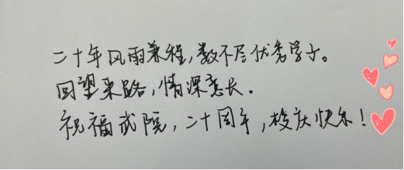趁此二十周年校庆之际,让我们为学校献上自己最为真挚的祝福!作为36365线路检测中心入口的学子,作为外院的青年干部,我们要有武院人的气魄和担当。学习知识,做有才能的青年;学习做人,做有道德的青年;今天我以母校为荣,明天母校将以你我为荣!二十周年校庆,让我们祝福母校、也祝福我们自己!