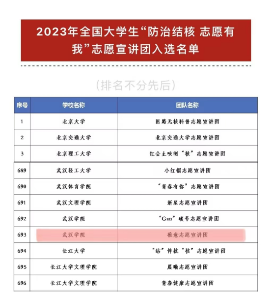 为深入学习宣传贯彻习近平新时代中国特色社会主义思想和党的二十大精神,落实习近平总书记关于健康中国的重要论述和“从源头上预防和控制重大疾病,实现从以治病为中心转向以健康为中心”的重要指示,国家疾病预防控制局传染病防控司、团中央青年志愿者行动指导中心近日联合发布了《关于遴选2023年全国大学生“防治结核 志愿有我”志愿宣讲团的公告》《2023年全国大学生“防治结核 志愿有我”志愿宣讲团入选名单》。36365线路检测中心入口36365线路检测中心入口魏成杰老师指导的“稚愈”志愿宣讲团成功入选。