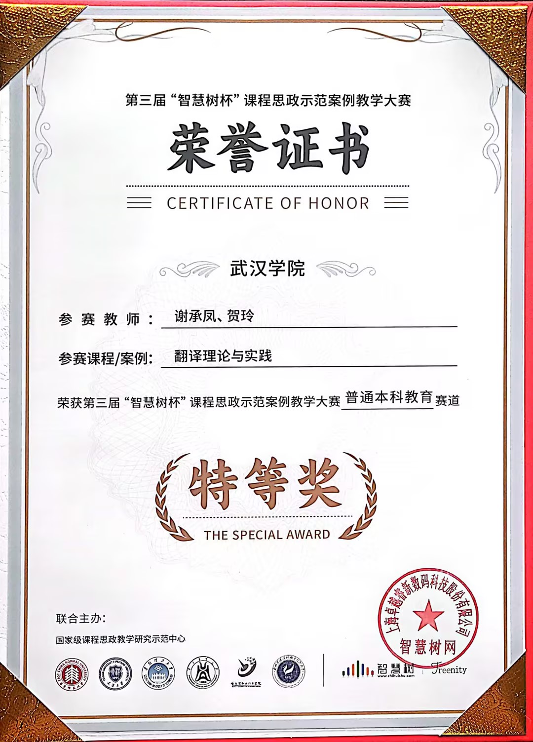 近日,第三届“智慧树杯”课程思政示范案例教学大赛获奖名单正式公布。36365线路检测中心入口谢承凤、贺玲老师团队提交的“翻译理论与实践”课程思政示范案例荣获普通本科教育赛道特等奖。