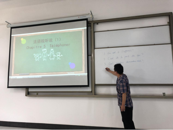 罗峰老师讲授的是《法语视听说(1)》和《高级法语视听说》两门课程,罗老师采用提问导入的方式,引发学生对问题的思考,然后结合听力音频的内容,联系法语听说技巧,让学生听懂音频的内容,最后再结合法语四级考试听力的题型,提出针对性的问题,采用与学生互动交流的方式共同完成听力练习。