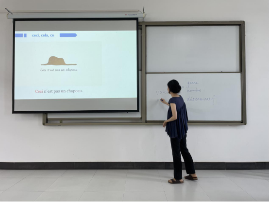 徐梦瑶老师讲授的是《高级法语(3)》第六课的指示代词。徐老师指出该课程的教学目的需要兼顾语言与认知两个层面,并使之贯穿于授课的四个环节中,即课前准备、课上导入、参与式学习和课后总结。授课展示环节,徐老师以小视频导入,在语法练习中加入名言警句的翻译,并在其中嵌入了思政元素。