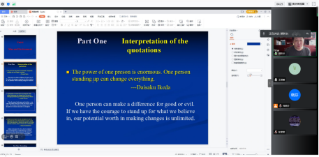 郭跃华老师讲授的是英语阅读(3)的第六课,这一课是关于人与环境的关系。郭老师首先用名人名言导入,引发学生对环境问题的思考,然后结合文章内容,联系阅读技巧,让学生总体把握课文主旨,同时也注重细节的理解。在授课过程中,郭老师还结合思政元素,让学生对环境主题展开讨论,并要求学生结合实际情况写出自己对环境问题的看法,以课后作业的形式提交。