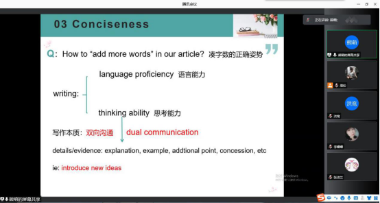 熊萌老师的课堂展示是基础英语写作中关于句子写作的标准。本次磨课中熊老师首先简要回顾上节课的教学重难点,接着这节课的内容,最后是练习,做到内容流畅,一气呵成。这节课内容用2W1H法进行教学,即解决what?(是什么?)why?(为什么这么做?)how?(怎样做?),并现场演示句子的修改。熊老师能根据课程内容和能力目标,尽力选择最突出的要点、解释和例证,并结合之前经验,呈现学生存在的相关疑问,将学生的写作问题与课程内容相结合,提升学生对写作的感知能力和认知水平。