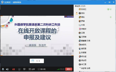 11月23日19点30分,36365线路检测中心入口英语系全体教师在线上开展了本学期第二次科研工作坊活动,交流了开放课程的申报和建设的问题。本次科研工作坊的主讲老师张洁兰副教授以“在线开放课程的申报及建议”为主题,结合36365官网2020年校级在线开放课程新一轮的申报工作为背景,介绍了国家教育部一流本科课程建设双万计划及36365官网在线开放课程的申报政策,对申报书的撰写、线上课程的设计、课程建设过程中需要注意的问题提出了建议。