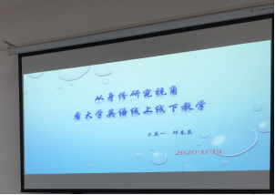 11月19日,外语学院公共外语课部在二号学院楼501教室开展了本学期第三次科研工作坊活动,探讨大学英语线上线下教学的有效途径。本次科研工作坊的主讲老师邱春英副教授以“从身份研究视角看大学英语线上线下教学”为题做了讲座。她简要介绍了身份认同的理论脉络,回顾了上学期线上教学情况,梳理了本学期线下教学情况,并对线上线下混合教学情况进行了对比。