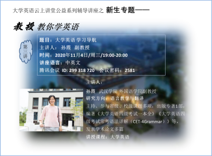 据悉,大学英语云上公益讲座新生专题已经过半,下一期将由来自公共课部的文声芳副教授介绍大学英语学科竞赛概述。
