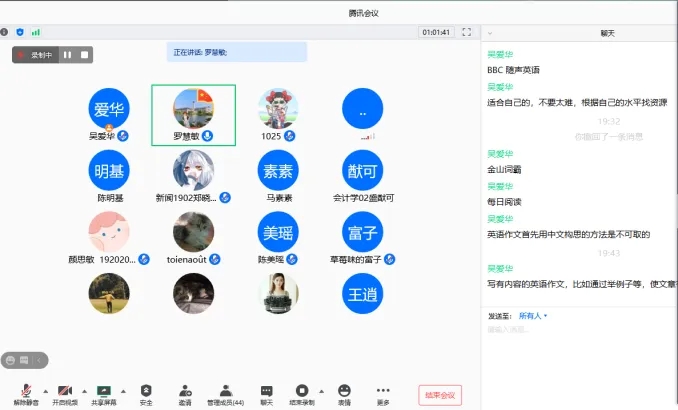 讲座结束后,同学们就自己关心的话题与罗老师进行交流。如有哪些途径可以提高自己学习英语兴趣?大学中高年级阶段如何对英语学习进行规划?大一新生怎么准备四六级考试等。线上讲堂里气氛非常活跃,同学们均表示此次讲座收获满满。