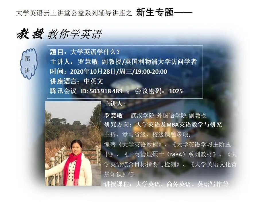本次线上讲座有公共外语课部吴爱华博士主持。下一期讲座将于11月4日周三晚7点开讲。来自公共课部的孙霞副教授将带你遨游精彩的大学英语学习世界。