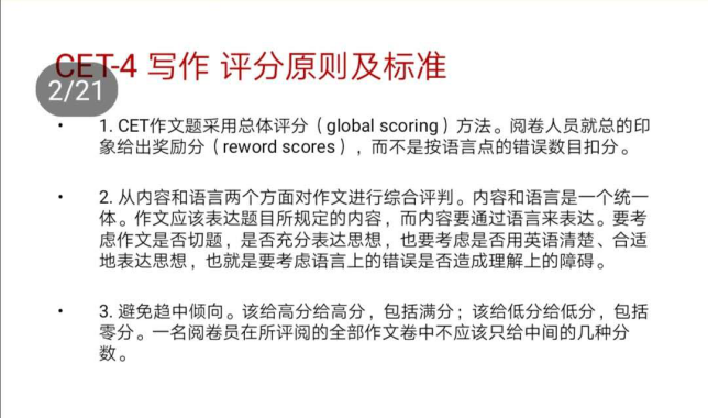 朱老师首先介绍了四级作文阅卷的评分原则和评分标准,强调了英语写作过程中“内容”和“语言”如何达到统一,还详细介绍了四级评卷过程中所遵循的标准及标准的运用,即,采用五档标准化样卷进行评级,判断作文是否切题、思想表达是否清晰、文字的连贯性及准确性如何等。
