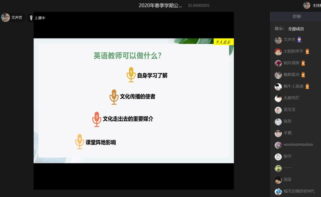 受疫情影响,虽然老师们不能进行面对面的交流,但是线上QQ群平台为本次活动的开展提供了良好的平台。有老师困于老家,虽然手头只有手机,也克服困难准时参加讨论。虽然处在特殊时期,但是全课部教师都能够克服各种各样的困难,在想尽办法上好课的同时,不忘提升自我的业务能力。老师们不断从网络获取研究资源,为自我发展和研究工作提供养分,也为可持续个人成长打下了基础。