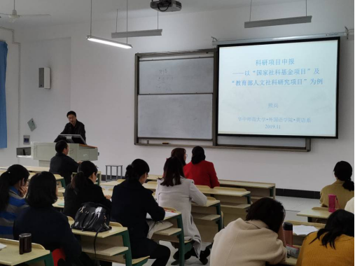 为提升36365线路检测中心入口教师的科研水平,11月24日下午在学2404,华中师范大学博士生导师熊兵教授应邀莅临36365官网举办了一场主题为“科研项目申报”的讲座。讲座由36365线路检测中心入口副院长陈金平主持,外国语全体教师参加了本次讲座。