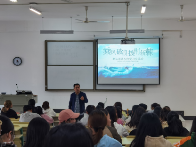 交流会伊始,罗峰、徐梦瑶、徐江雪三位老师分别介绍了英法方向学生的学习目标和要求、大学法语四级考试的概况,以及大学生活的准备和规划。随后,18、19级的6位学生代表上台发言,分别从大学法语四级备考、英语专业四级备考,以及大学生活与实践三个方面,与同学们分享学习和备考经验,交流心得体会。