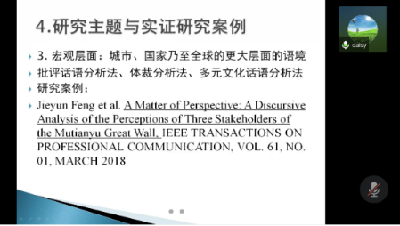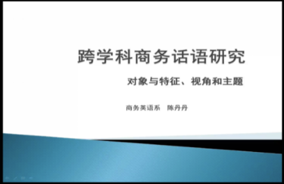 12月20日13点45分,商务英语系全体教师通过腾讯会议开展科研工作坊活动。本次科研工作坊活动主题为“跨学科商务话语研究:对象与特征、视角和主题”,主讲教师为商务应用教研室陈丹丹老师。本次活动由蓝建青老师主持。