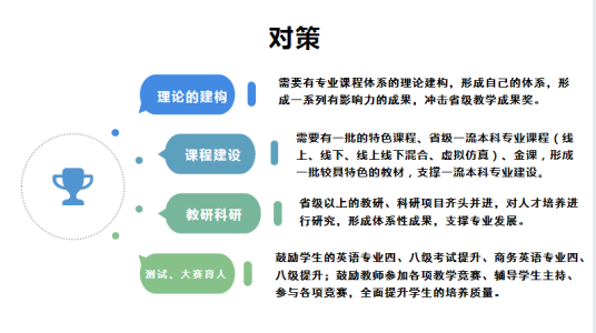 蓝建青从今年商务英语国家一流专业申报表的填写情况、商务英语一流本科专业建设点的困境、商务英语一流本科专业建设点建设对策三个方面进行了分享。首先,蓝建青详细介绍了商务英语国家级一流专业申报表的填写情况,主要包括专业基本情况、近3年本专业获省部级及以上奖励和支持情况、深化专业综合改革的主要举措和成效等,让各位老师对商务英语一流本科专业建设的情况有了更深入的了解,也让老师们可以从大局出发,明确商务英语专业建设的痛点。随后,蓝建青对目前商务英语一流本科专业建设的困境进行了详细的阐述,第一,对照一流本科专业标准,专业建设水平与国家级一流专业还有较大差距;第二,现有建设基础较为薄弱,短时间内较难达到标准;第三,教师参与一流本科专业建设的动力不足,未能形成合力,聚焦课程和专业建设。针对上述困境,蓝建青提出了三点对策,首先,需要对商务英专业现有的课程体系进行理论建构,形成自己的体系,撰写研究论文,取得有影响力的成果;其次,需要建设一批特色课程,如省级一流线下课程、线上课程、线上线下混合课程和虚拟仿真课程,达到金课标准,需要各位老师的积极参与;第三,教研科研的项目需要齐头并进,不可偏颇;最后,要通过提升学生的专业考试通过率、师生参加竞赛来全面提升教师教学水平和学生的培养质量。