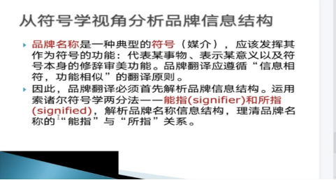 陈雪老师从品牌名称的含义、国内外对品牌翻译研究的现状、以及研究的背景和意义三个角度进行了分享。品牌翻译即品牌名称翻译,是指“用其它语言对商品品牌中的语言符号进行阐释”。中国企业在“走出去”方面取得了长足的进展。而品牌英译是中国企业和产品走出去的一个重要的步骤,也是推行品牌战略的重要环节。对我国企业,尤其是知名大企业的发展具有重要的辅助作用。但目前,很多中国企业家对品牌的中文非常谨慎,反复斟酌,而对英文名则较为随意,缺少研究。品牌翻译中仍存在很多误区。