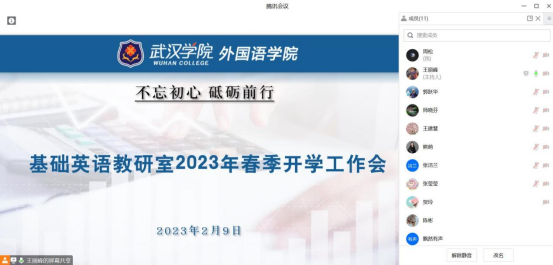 2023年2月9日晚,基础英语教研室召开了2022-2023-2 学期的第一次工作会议,会议由王丽峰老师主持,基础英语教研室全体自有老师和外聘老师都参加了会议。