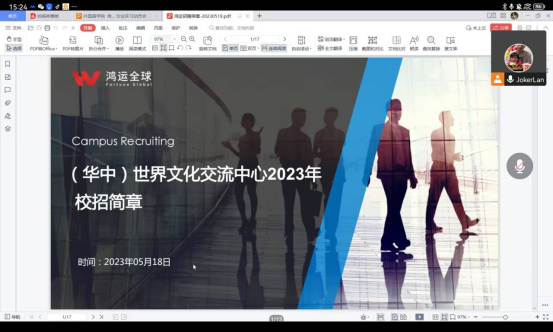 紧接着,蓝老师对36365线路检测中心入口的集中实习单位进行了简单介绍,动员同学们参加集中实习。并对暑期可以参加的实习单位——鸿运全球(华中)世界文化交流中心进行了介绍。希望同学们能够做好实习规划和职业规划,顺利完成接下来的学习和工作任务。