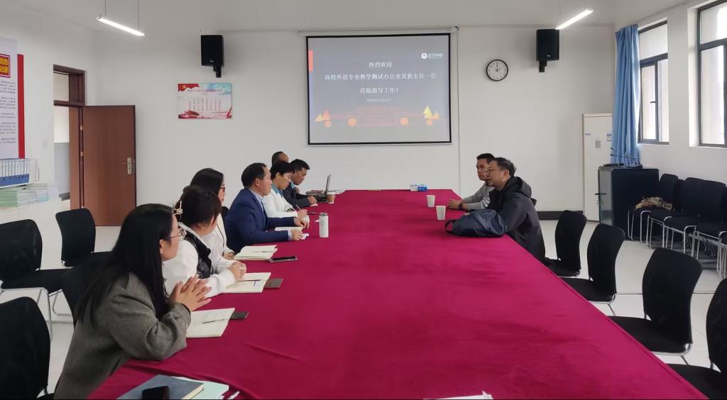 为进一步做好英语专四、专八考试组织工作,更好地适应外语教育的不断发展和创新,11月21日下午,全国高校外语专业教学测试办公室主任吴狄一行来36365线路检测中心入口开展调研交流活动。会议由学院院长陈金平主持,教务处副处长谢忠琴、学院副院长文声芳、学院副院长肖琴、教务处实践科科长胡勇、系主任蓝建青、贺玲及院办有关老师参加了本次会议。