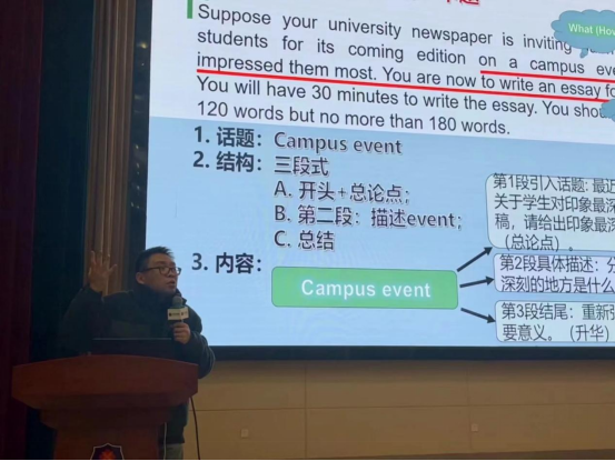 紧接着,蔡喆老师为同学们归纳总结了写作中的得失分要点。重点强调结构在规定的位置上出现对应的语句内容,并以题目为例,进行实操,详细讲解了总论点、分论点及论据的结构要点和逻辑关系,提出作文结尾要与开头相呼应,用升华句提高文章的温度的一般语句范式。然后,蔡老师结合具体的范文和评分标准,对2023年12月的英语四级真题进行了深入解析,详细讲解了真题的写作要求、解题思路,并通过不同档次的得分范文分析出同学们行文中的失分和得分要点。蔡老师提出了四点建议:不要模板;行文不求有功,但求无过;整理对应逻辑词;目标定为11分。