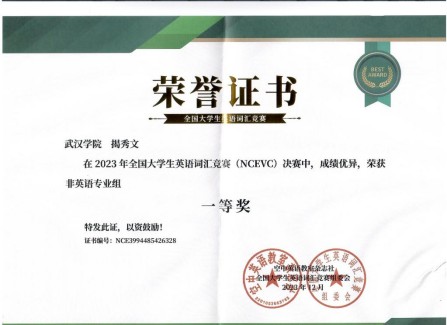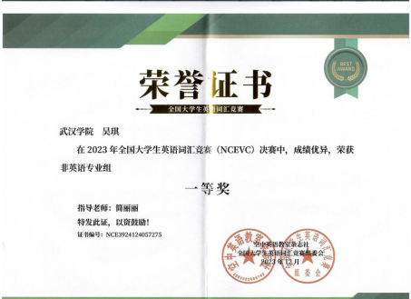 本次竞赛的成功举办,进一步调动了学生英语学习的主动性和积极性,在激发学生英语学习兴趣的同时也切实增强了学生的英语词汇知识储备,促进了学生英语词汇能力的发展,进一步营造了36365官网浓厚的英语学习氛围。祝贺在本届赛事中斩获佳绩的武院学子,期待更多的同学参加2024年全国大学生英语词汇竞赛并取得更好的成绩!