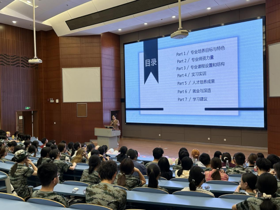其中英语系主任王丽峰在中2103面向全体英语专业学生进行介绍。她主要强调英语专业以培养国际化应用型外语人才为目标,具有明确的培养特色和方向。本专业师资力量强,课程设置合理,包括学科基础课程、专业理论课程和专业实践课程,注重培养学生的综合应用和实践能力。专业核心课程涵盖多个方面,特色课程则针对不同方向进行设置。英语系拥有省级一流课程“高级英语”“翻译理论与实践”,和多门校级在线课程。在人才培养成果方面,学生在竞赛中屡获佳绩,有丰富的交流访学机会,且积极参与第二课堂活动。此外,学校还提供了多种奖助学金。对于就业与深造,该专业毕业生就业前景良好,考研率也呈上升趋势,不少学生考取了国内外知名高校。在学习建议上,她说学生应明确目标,重视课程学习,积极进行课外拓展,掌握有效的学习方法,并充分利用图书馆、网络等资源。